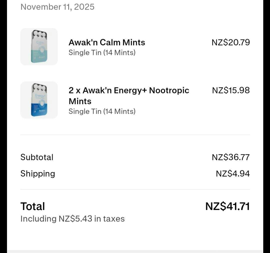 I purchased an "Awak'n Calm Mints" tin during what I believed was a Black Friday sale, only to find I was severely overcharged. Sportsfuel charged me NZ$20.79**, while the manufacturer's website sells the exact same product for **NZ$11.99.